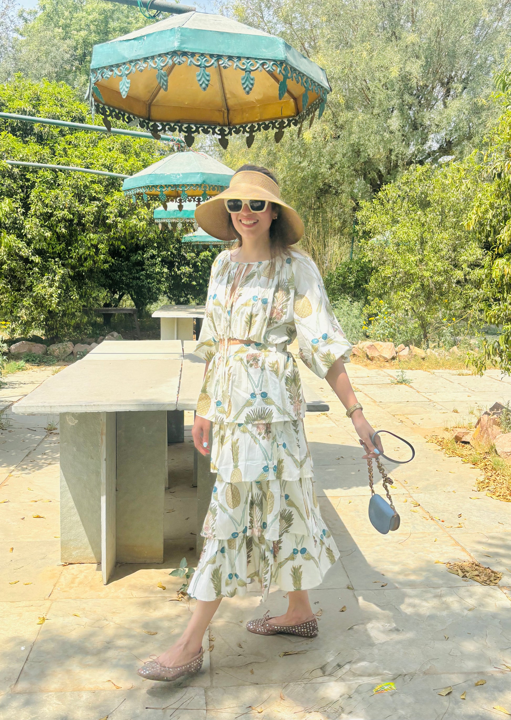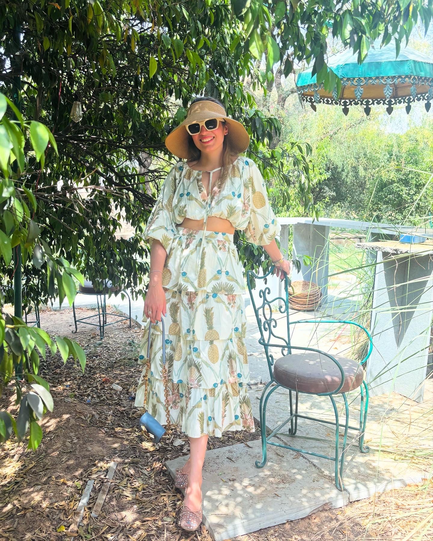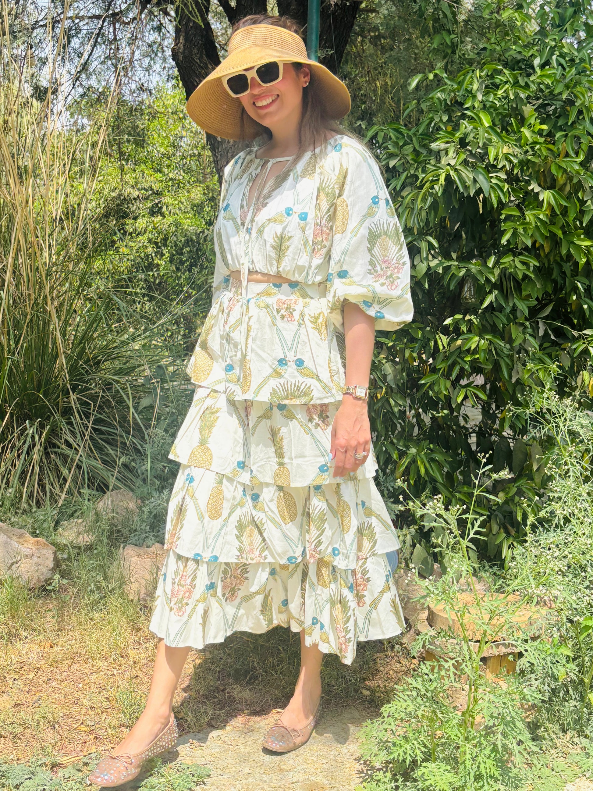 Step into sunshine with this effortlessly elegant co-ord set, designed for the modern muse who loves playful charm with a touch of polish. The ensemble features a beautifully tiered midi skirt, cut in soft, breathable cotton that sways with every step. Its hand-illustrated pineapple and floral print evokes lush, tropical escapes, while the light cream base adds freshness and versatility.