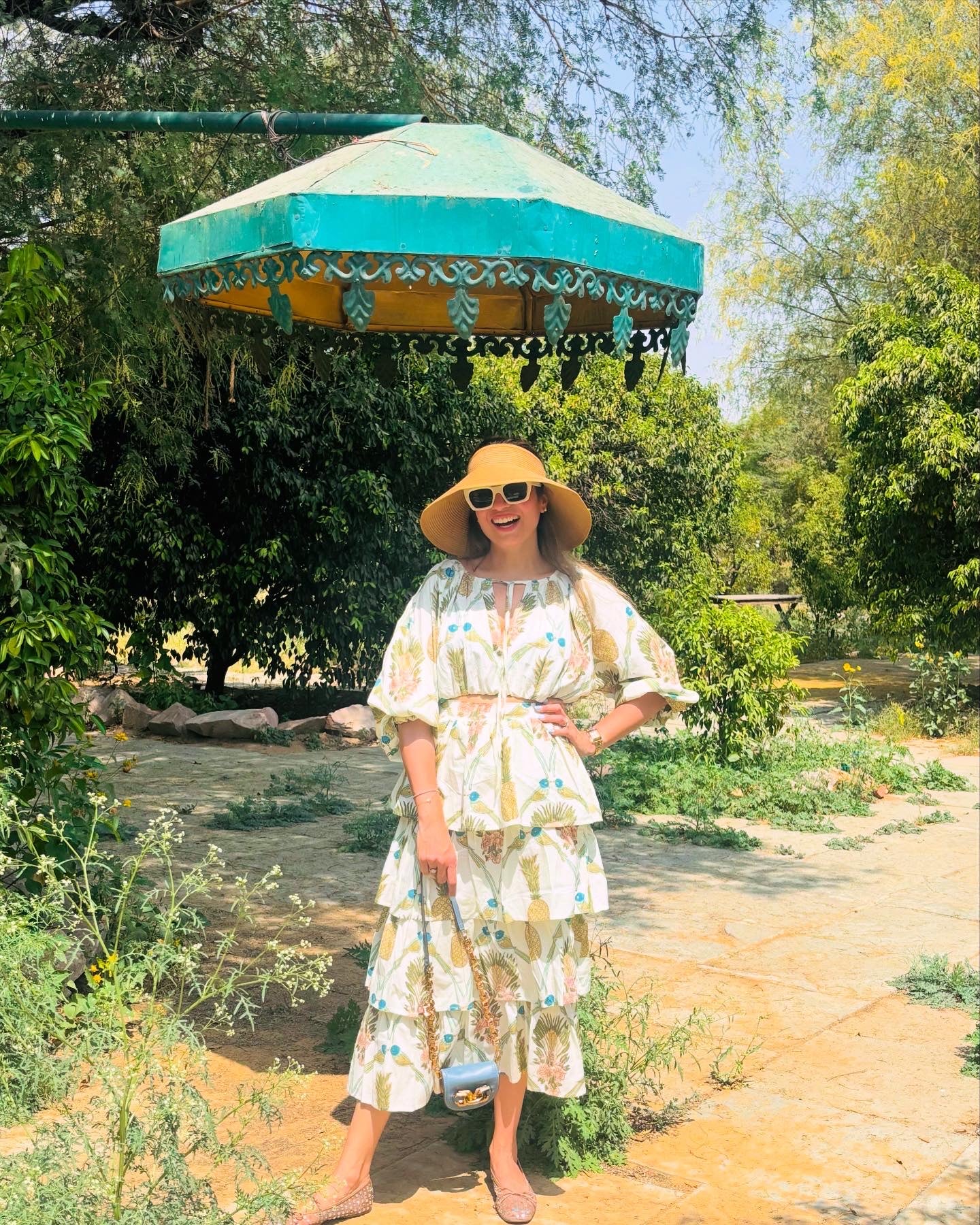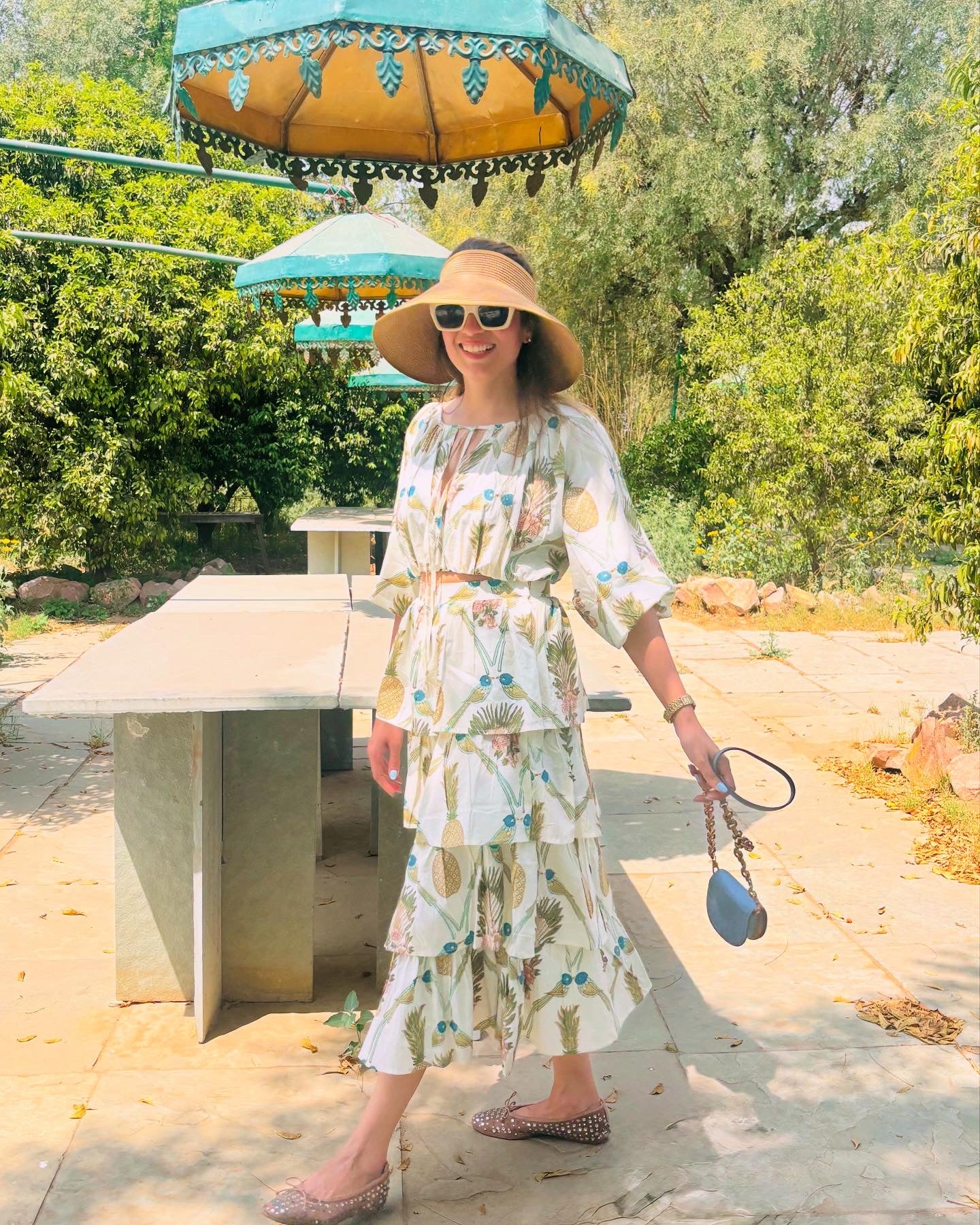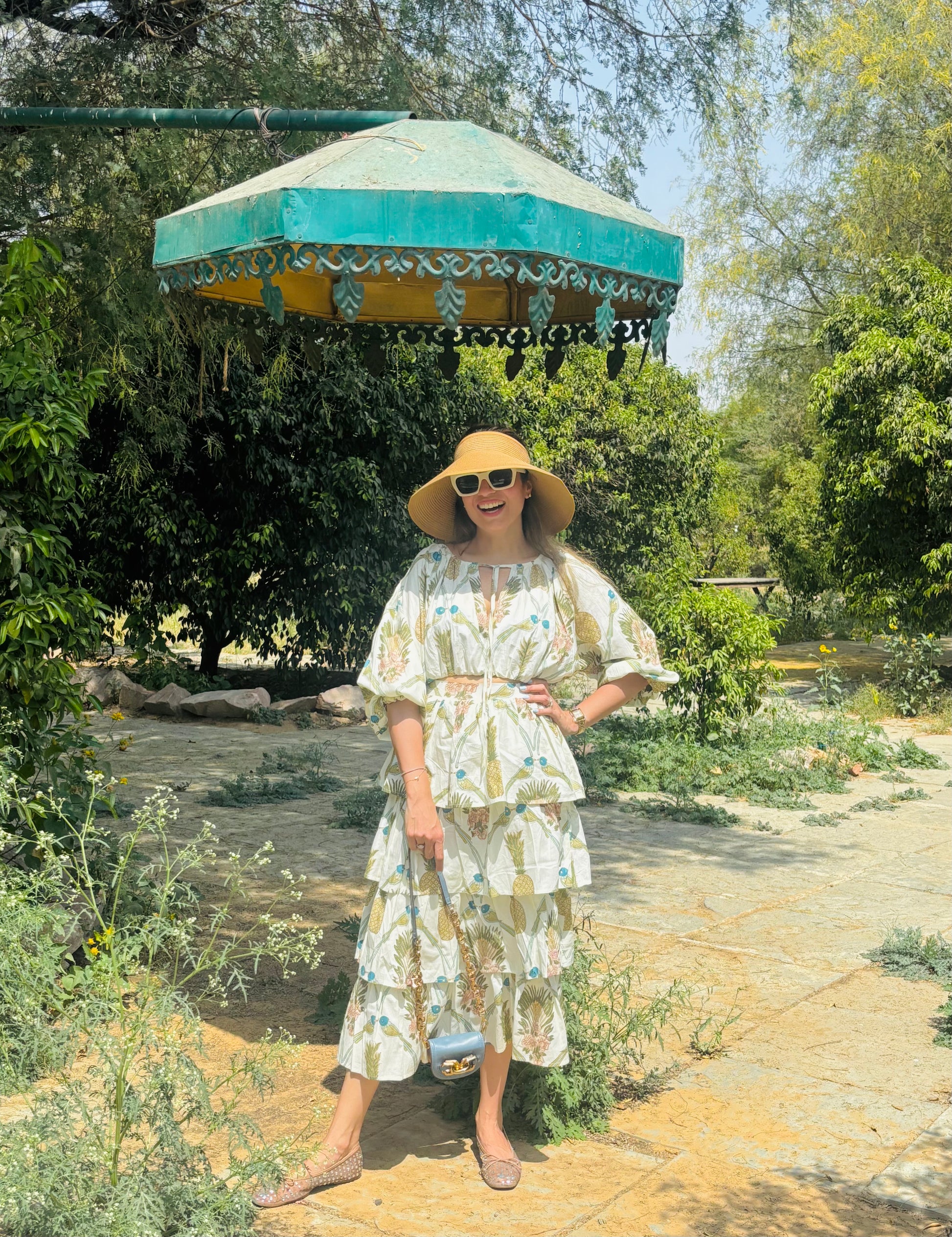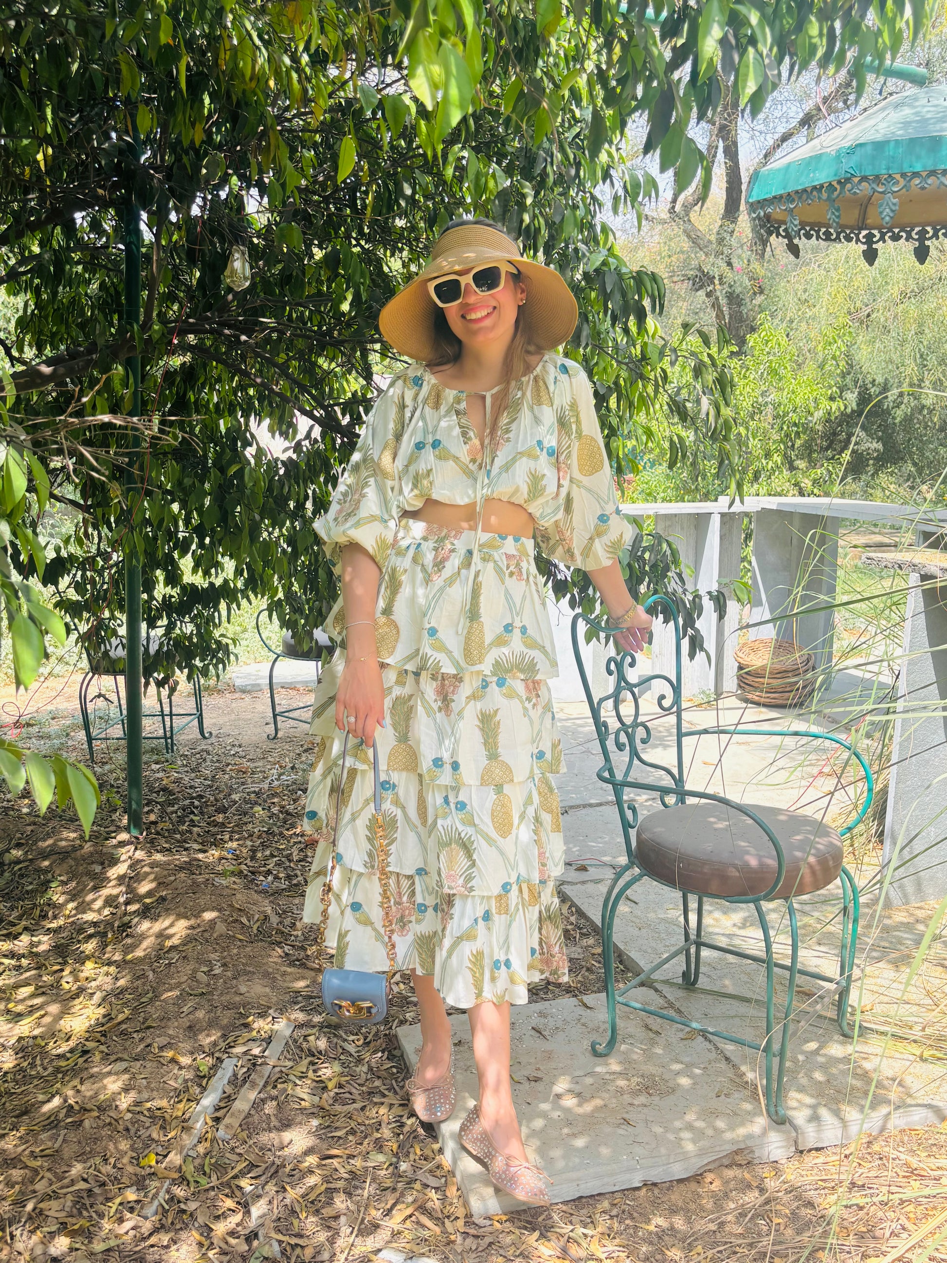 Step into sunshine with this effortlessly elegant co-ord set, designed for the modern muse who loves playful charm with a touch of polish. The ensemble features a beautifully tiered midi skirt, cut in soft, breathable cotton that sways with every step. Its hand-illustrated pineapple and floral print evokes lush, tropical escapes, while the light cream base adds freshness and versatility.