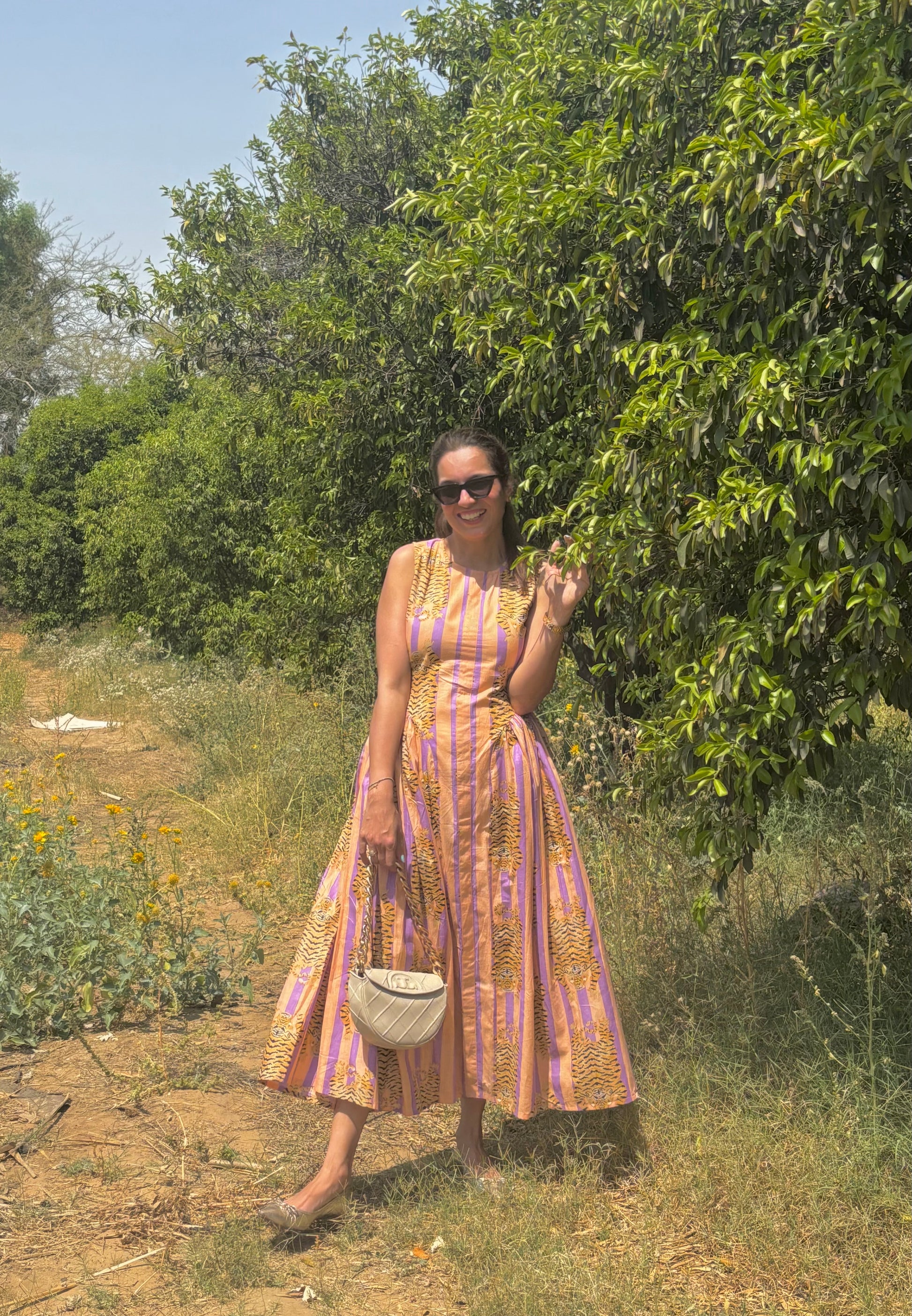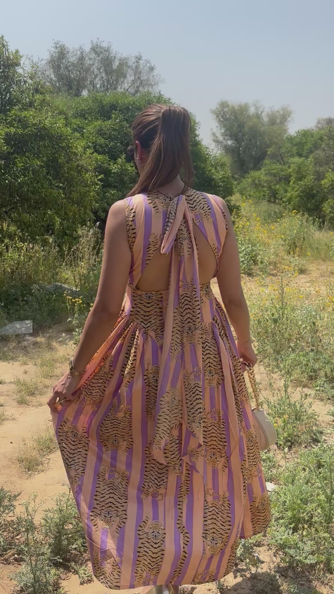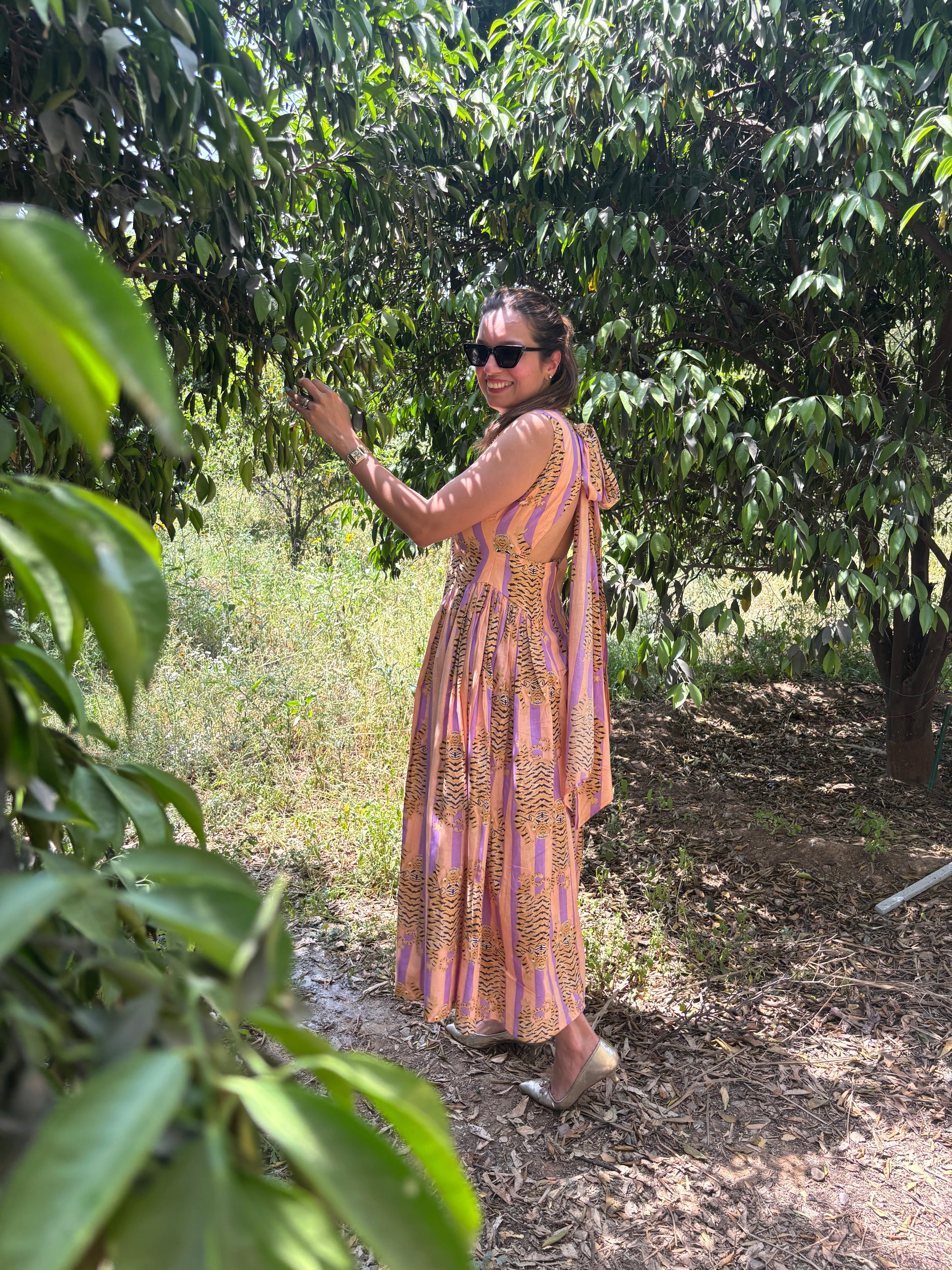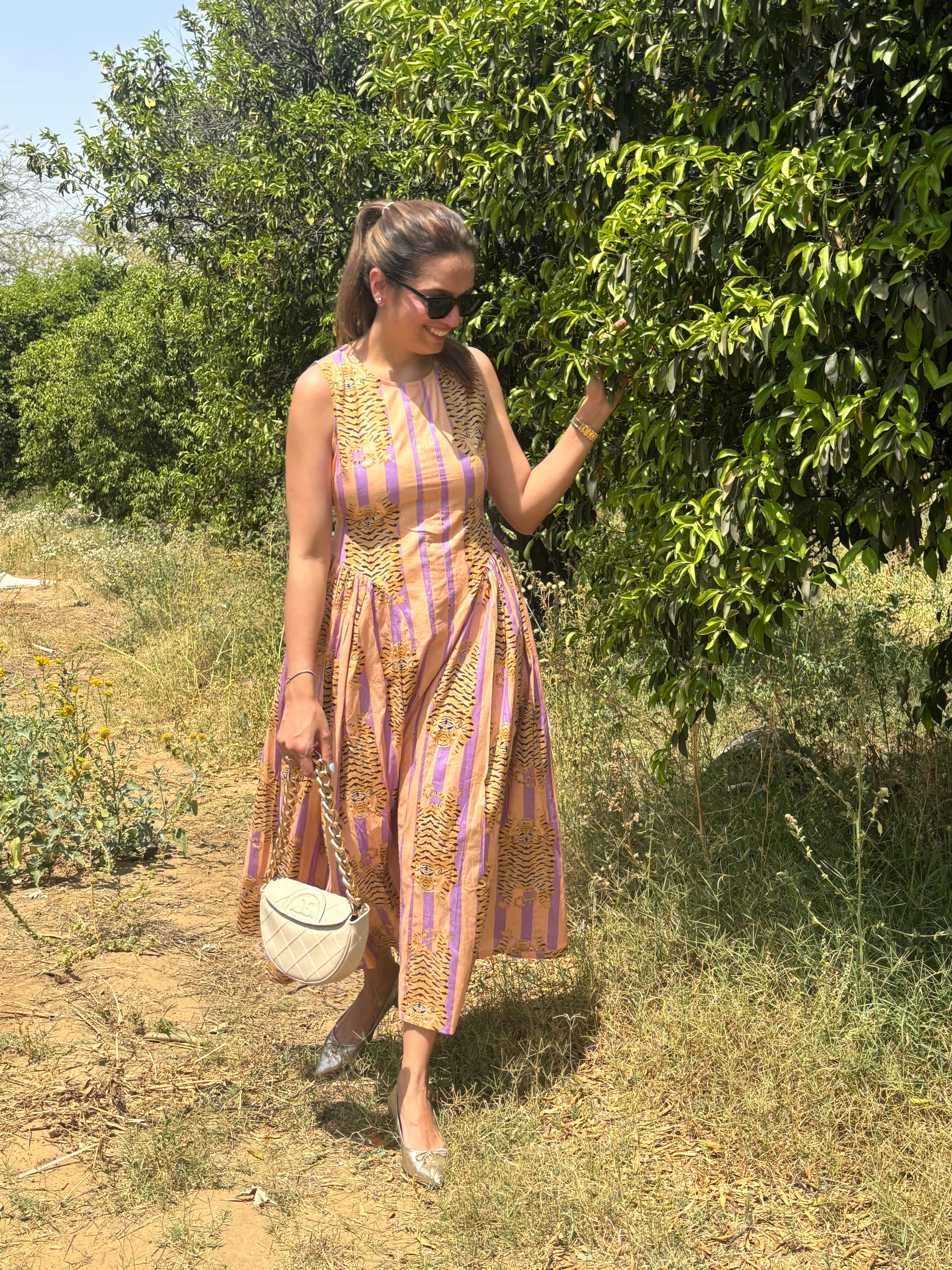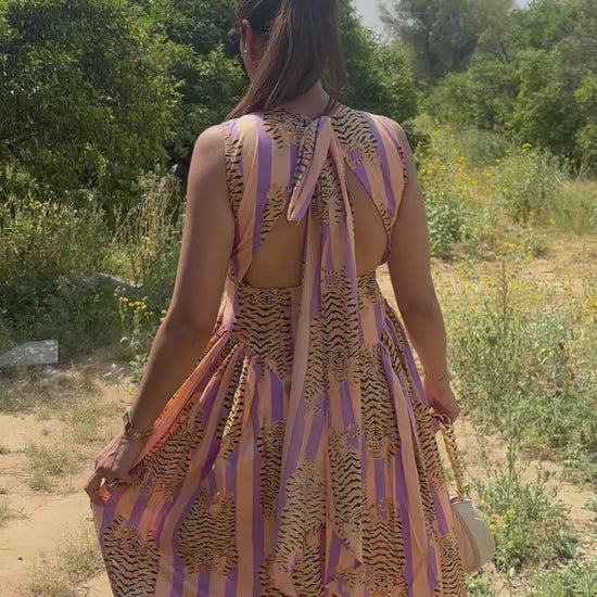 Crafted in 100% breathable cotton, the dress is light, airy, and perfect for warm days. The soft lavender base is uplifted with tiger-stripe inspired motifs in golden mustard — a playful nod to bold femininity, softened with pastel undertones.